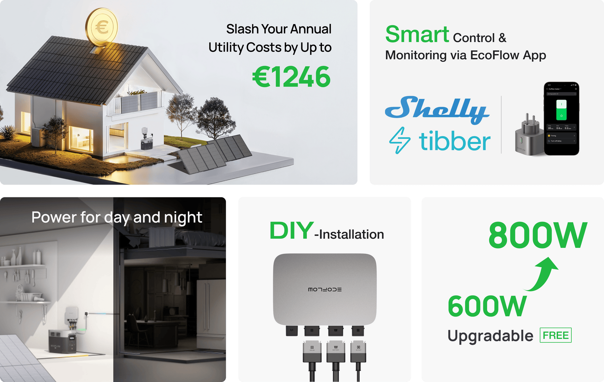 EcoFlow PowerStream Solar System is a balcony solar system with a portable power station that allows you to use solar energy day and night and reduce energy bills. EcoFlow Smart Plug and EcoFlow app enable real-time energy usage monitoring and optimization.