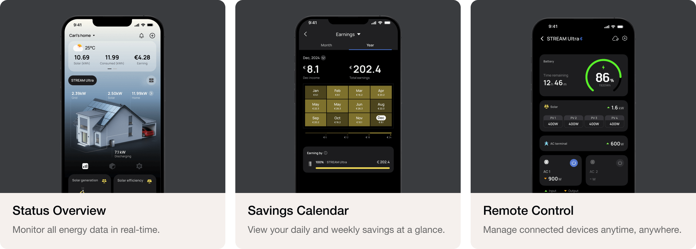 The AI-powered system monitors all connected devices in real time, ensuring each unit receives enough solar energy to run your appliances. If the EcoFlow STREAM AC Pro in your kitchen runs low, AI-driven load balancing automatically redirects energy from nearby units—keeping your fridge running on solar without interruption.