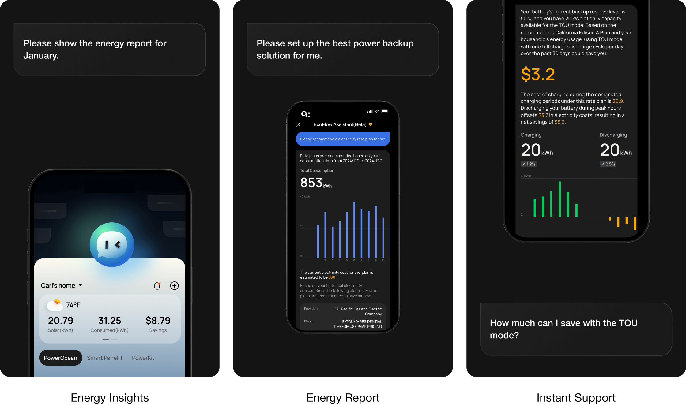 The app turns complex energy data into clear, actionable advice. Get a full energy overview and personalised report with just one tap. Control your devices with natural commands and receive instant support whenever you need it.