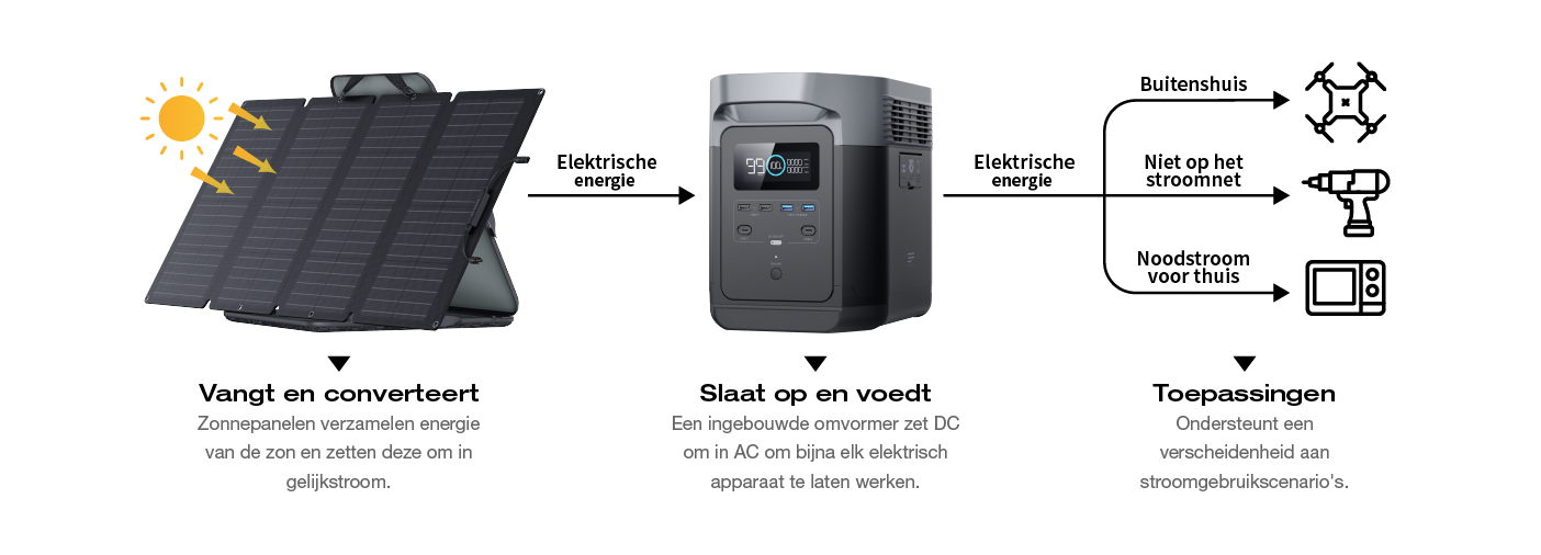 Na het verzamelen en opslaan van DC/gelijkstroomenergie zet de zonnegenerator DC om in AC/wisselstroomelektriciteit die apparaten zowel binnen als buiten van stroom kan voorzien.