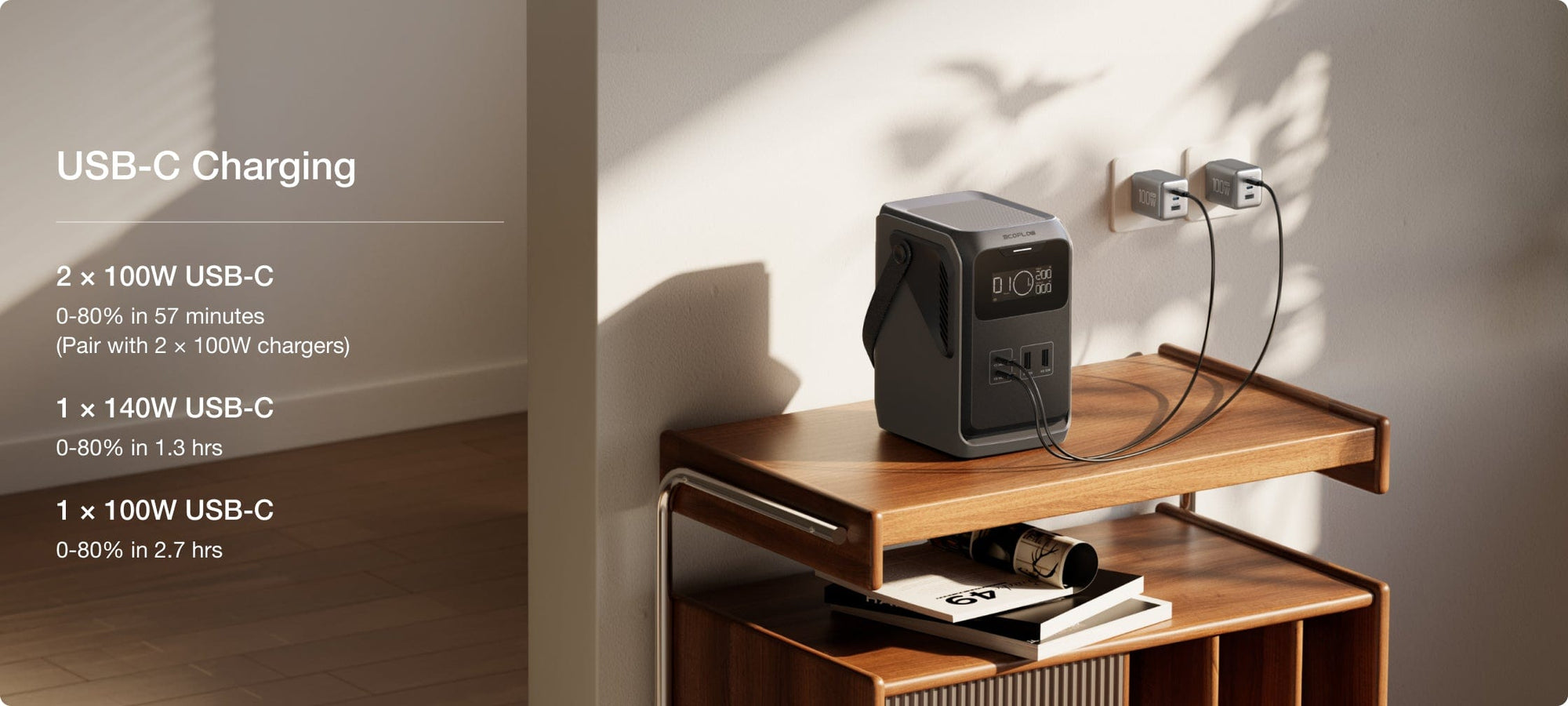 Laad op via een PD USB-C-poort van 140 W en geniet altijd en overal van buitenenergie met TRAIL.