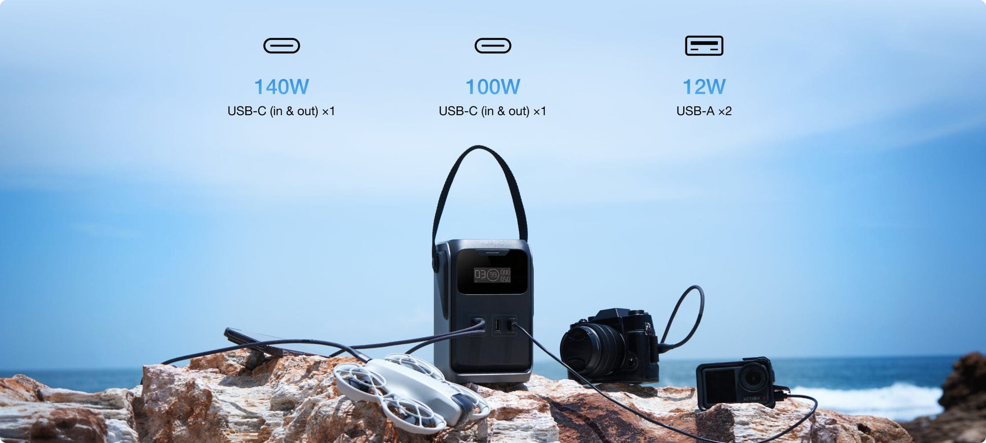 Pure DC-vermogen levert een totaal vermogen van 220 W (140 W max. één enkele poort) - genoeg voor 90% van de essentiële buitenuitrusting. Perfect voor al uw lichte kampeerbehoeften aan stroom.
