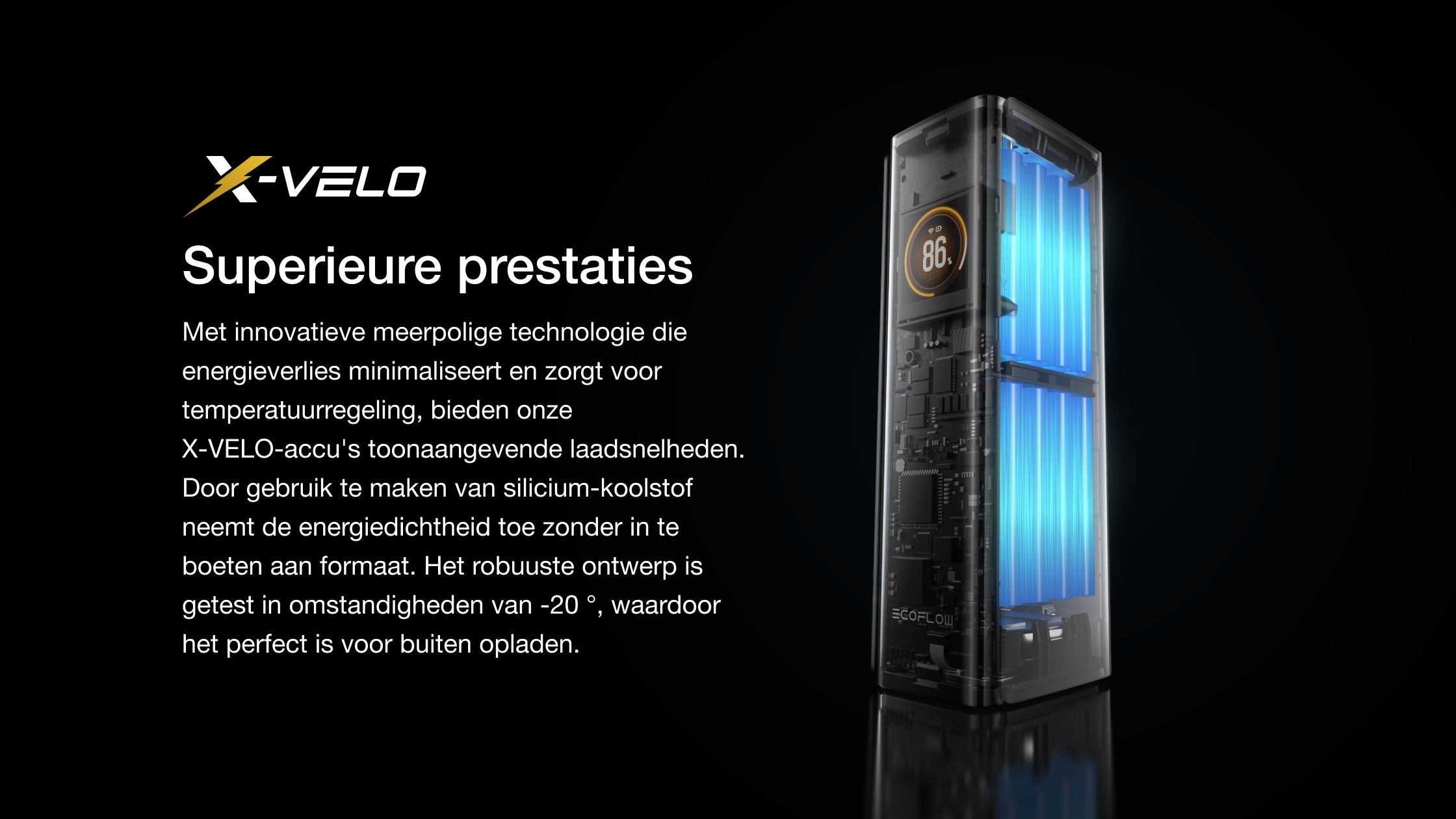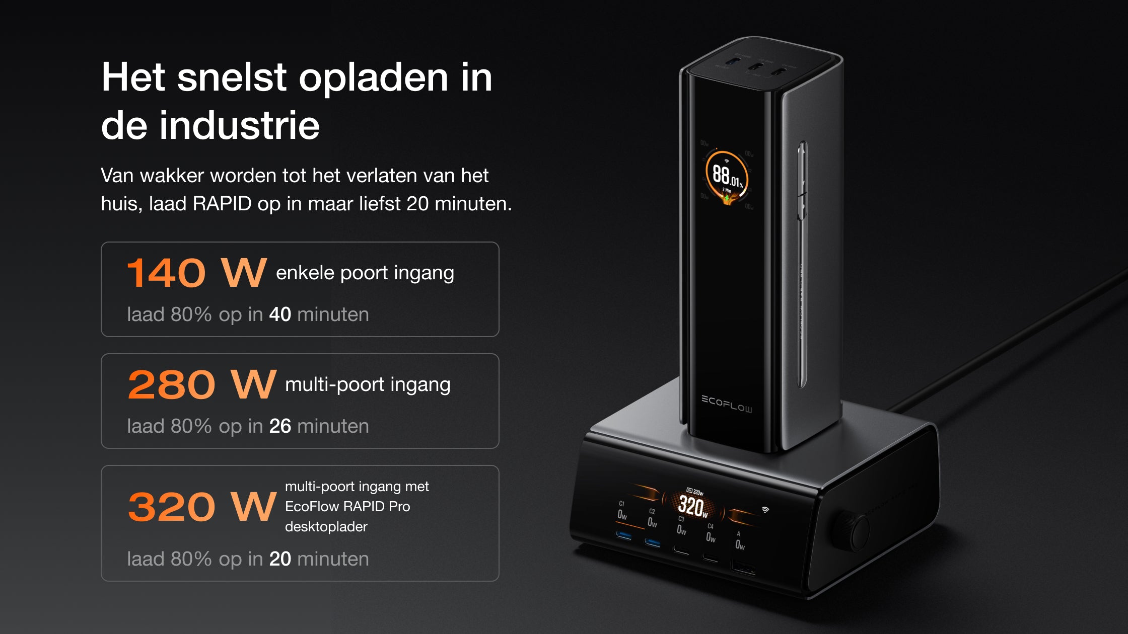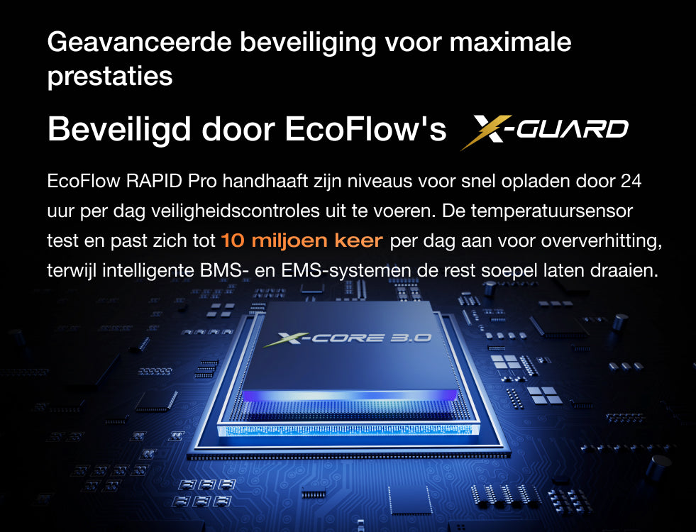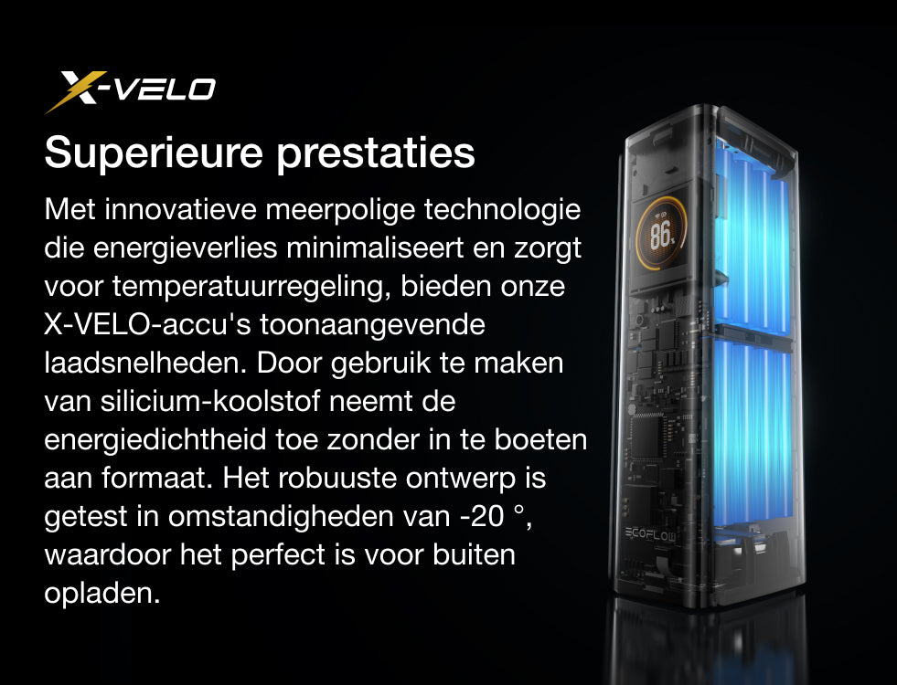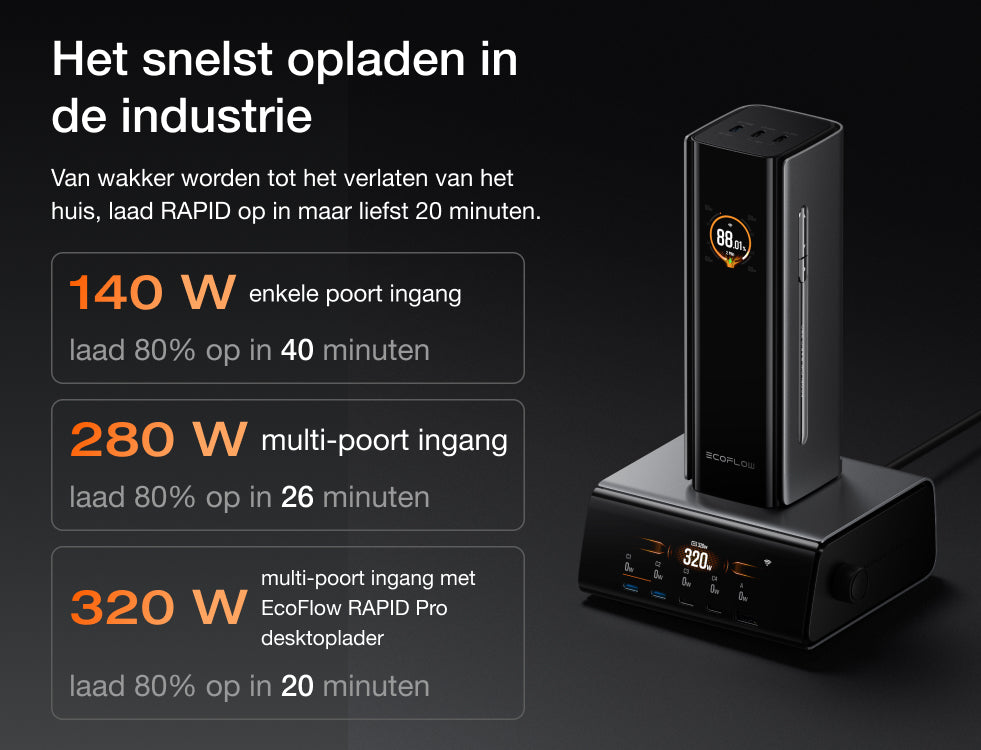 • Snelle oplaadsnelheid: 20 min. op te laden tot 80% met behulp van EcoFlow RAPID Pro 320 W oplaadstation.²