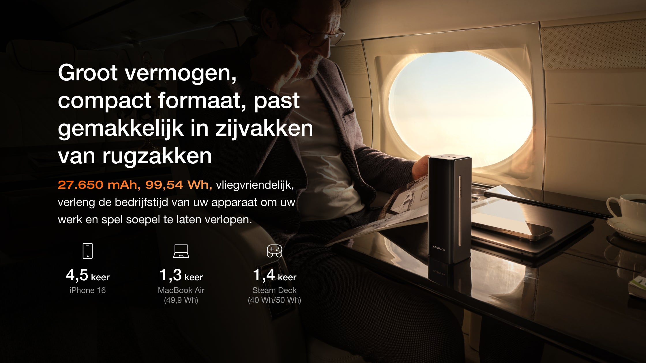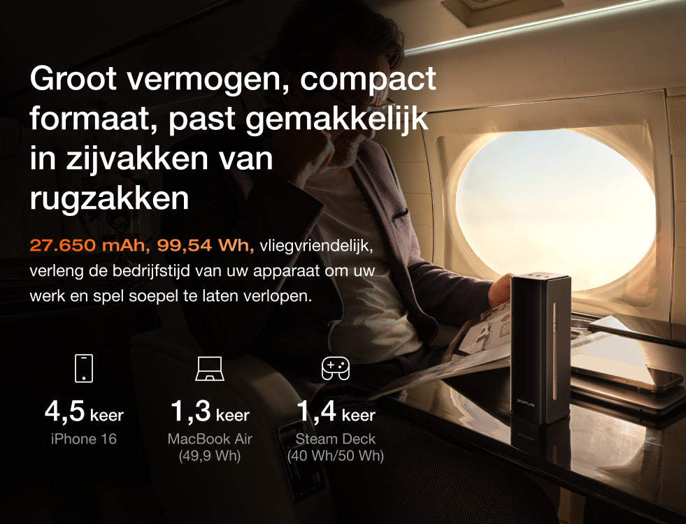 • Compact formaat, enorm vermogen: 27.650 mAh (99,54 Wh) vliegreisvriendelijk